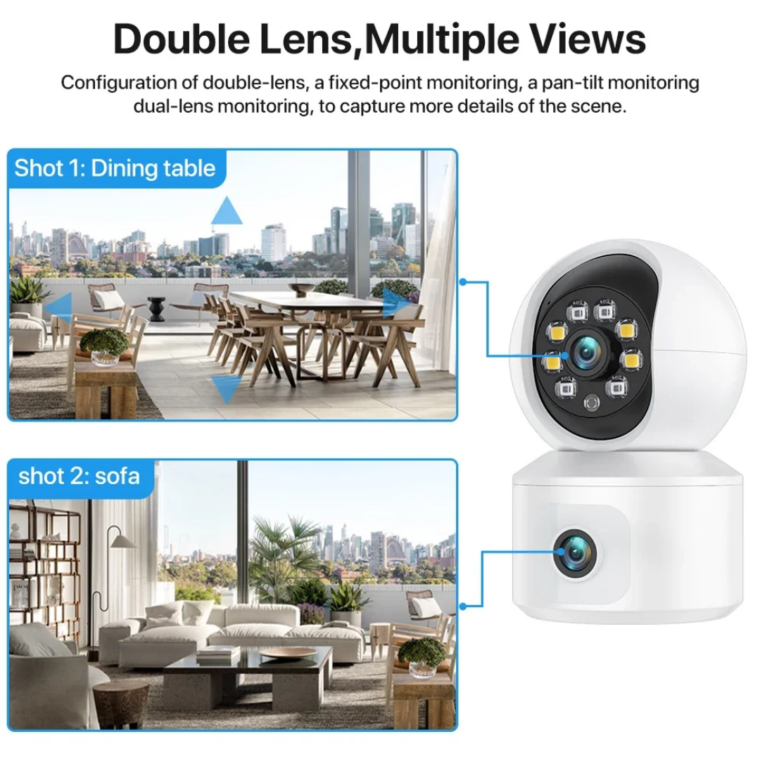 دو لنز مستقل: این دوربین با داشتن دو لنز، امکان مشاهده و ضبط تصاویر از دو زاویه مختلف را به صورت همزمان فراهم میکند. این ویژگی به والدین کمک میکند تا نظارت کاملی بر محیط اتاق کودک داشته باشند.